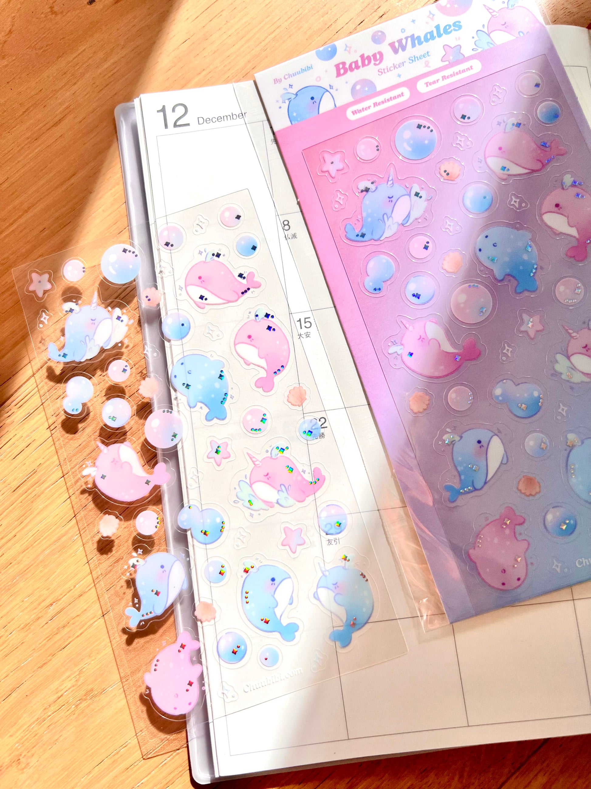 Hop onto the sticker craze with these baby whale sticker sheets. Their clear and glossy finish adds a pop of color and cuteness to any surface!