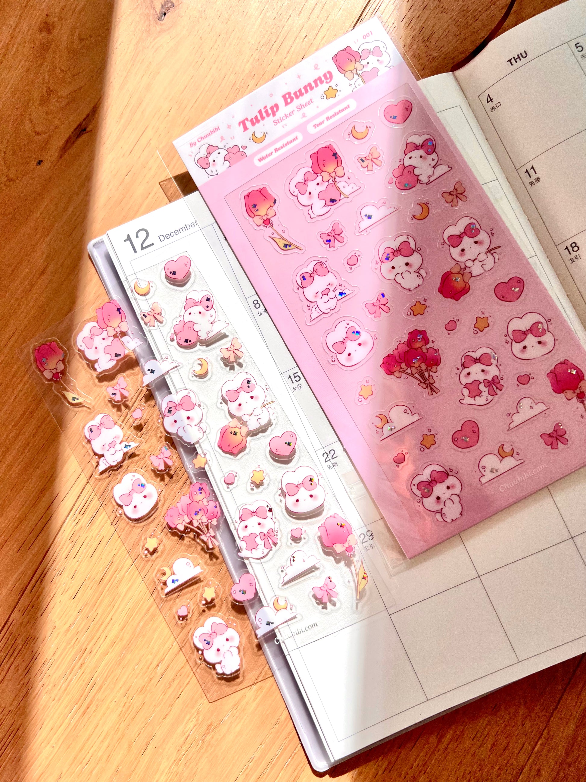Hop onto the sticker craze with Tulip Bunny sticker sheets. Their clear and glossy finish adds a pop of color and cuteness to any surface!